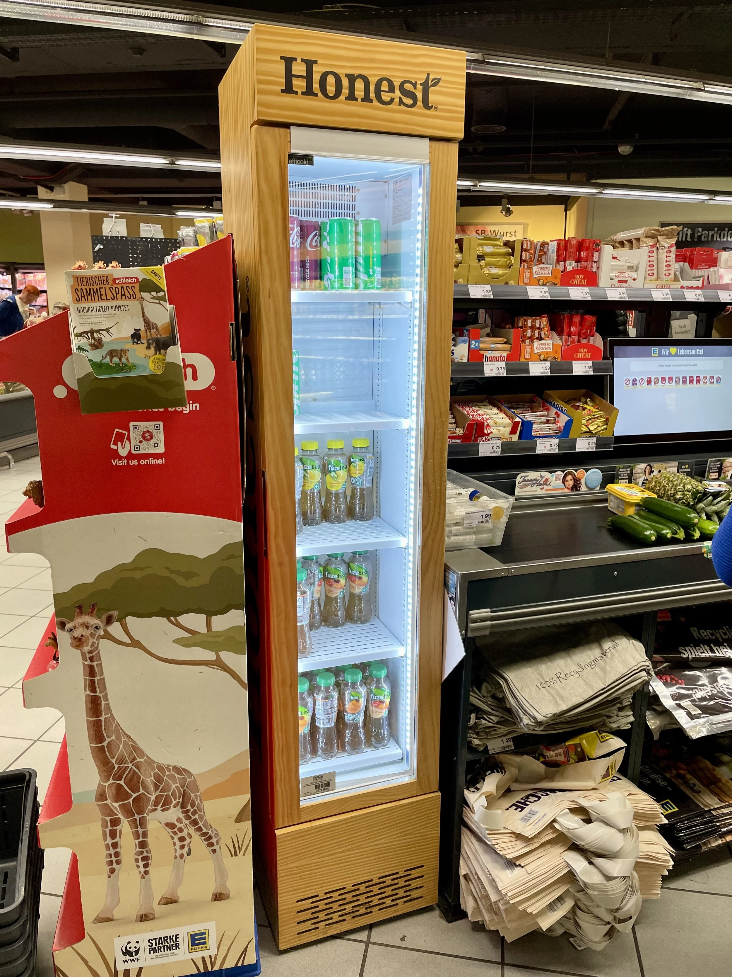 Hier wurden die Bio-Tee-Getränke der Marke »Honest« in einem Kühlschrank aus Fake-Holz präsentiert, offensichtlich ohne durchschlagenden Erfolg (Eigenes Foto).