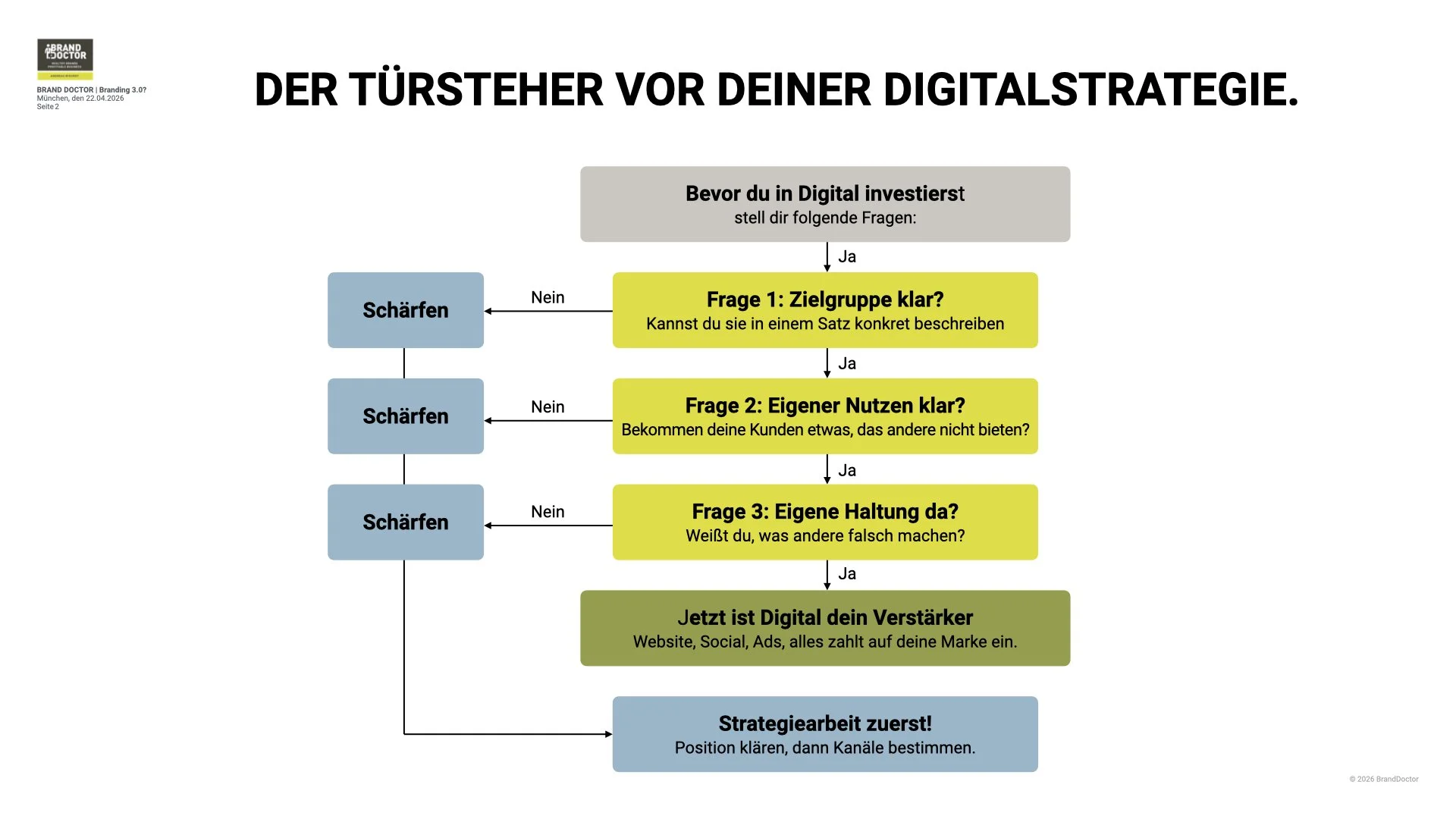 Drei Fragen, die geklärt sein müssen, bevor deine Digitalstrategie wirken kann. (Abbildung: BrandDoctor 2026)